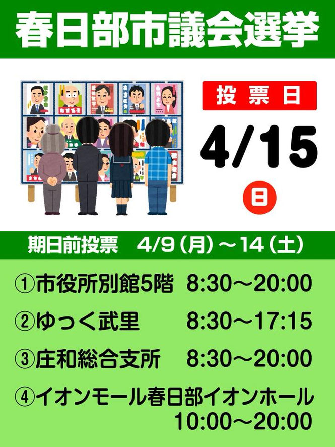 2018/04/13 市会選・6日目 春日部市議会議員選挙は残り2日間。この戦い断じて負けられません。 週末の天気、特に日曜日は大荒れの予報です。投票もれのないよう、期日前投票をご利用願います。 tagPlaceholderカテゴリ: 埼玉県, 春日部市, 活動記録, 2018年活動記録, 2018年4月活動記録